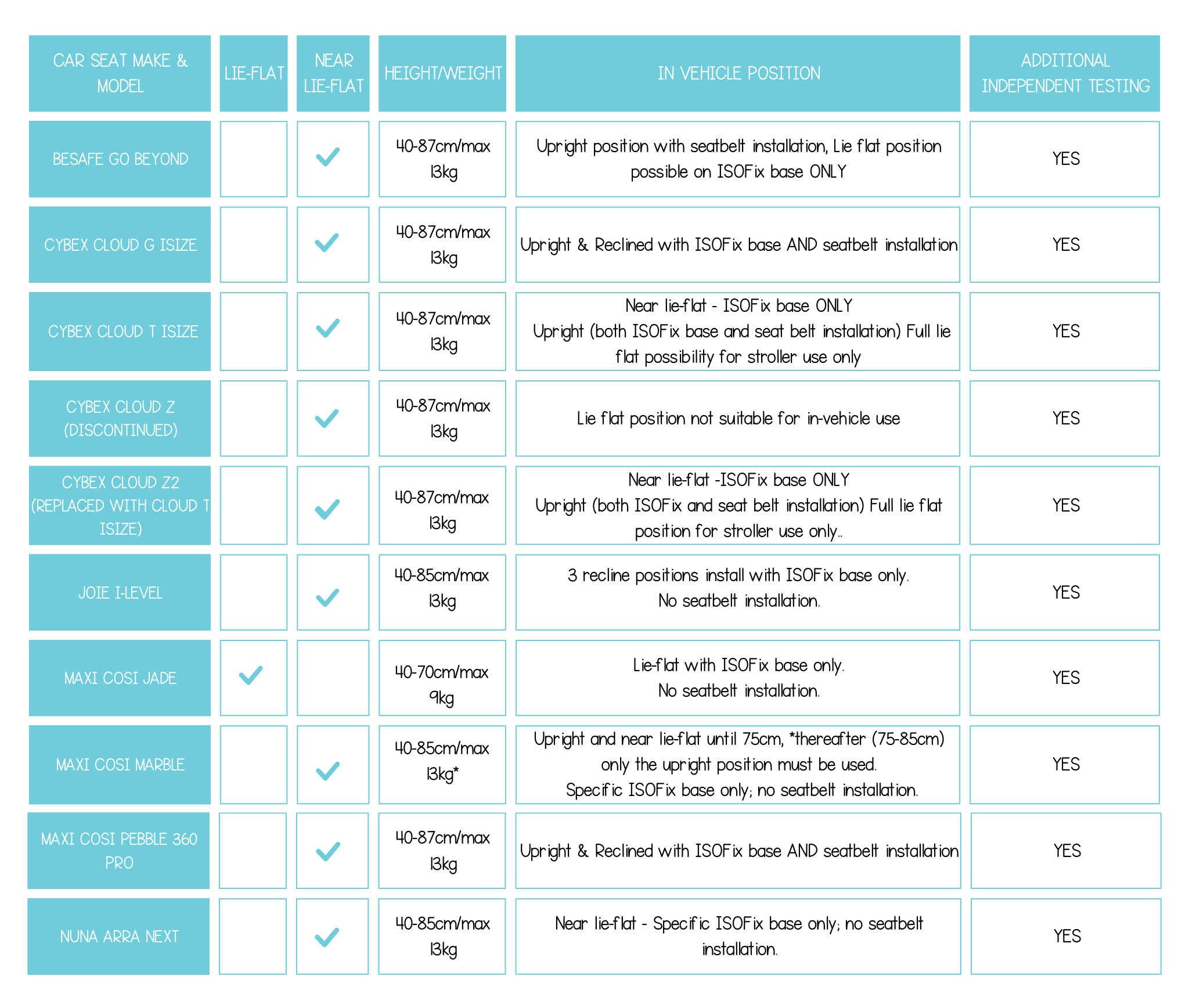 Always check your manual because not all near lie-flat car seats can be used in the near lie-flat position in the vehicle.